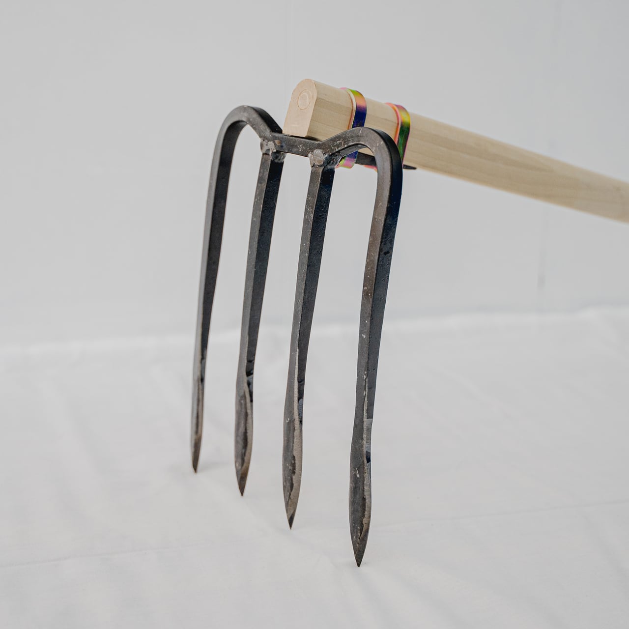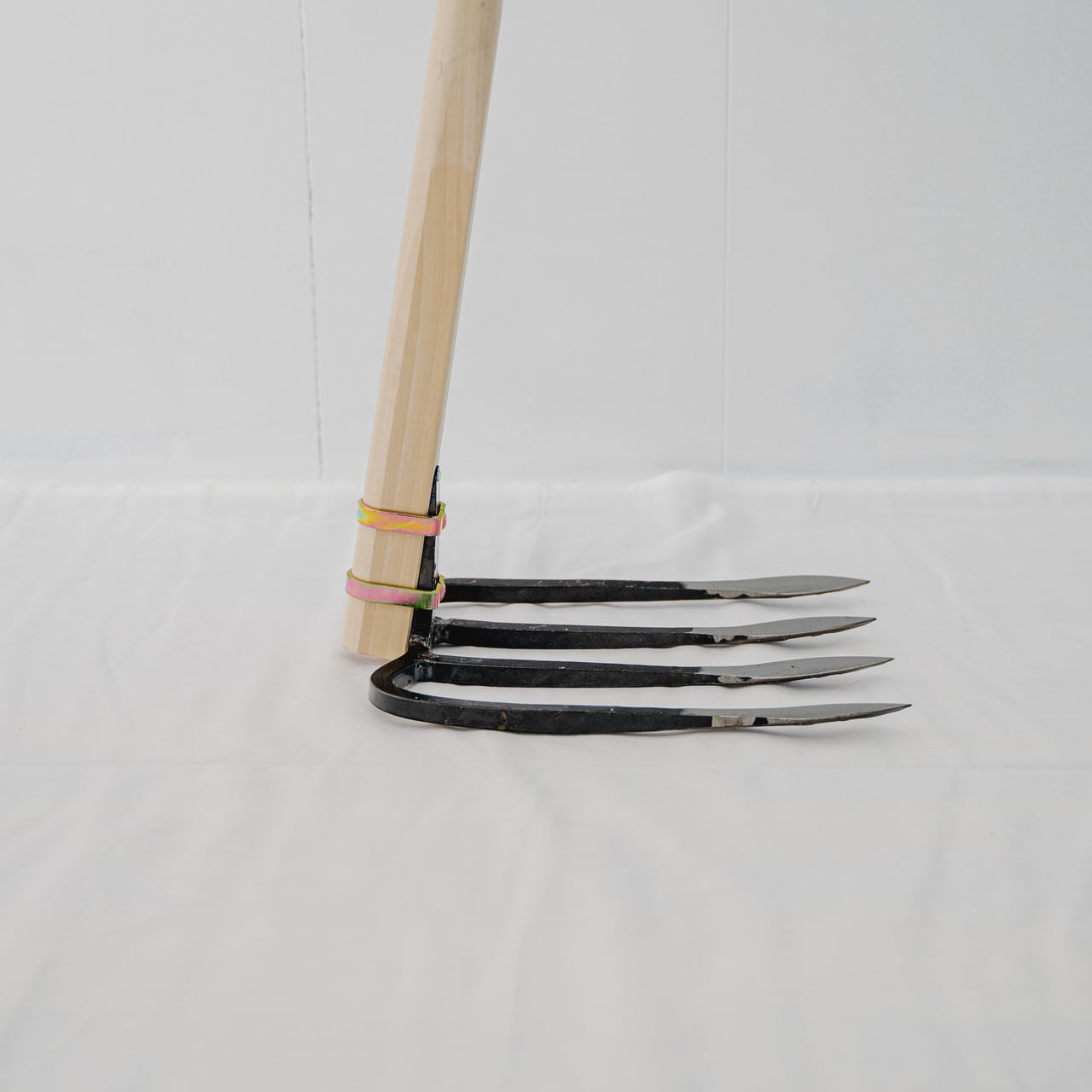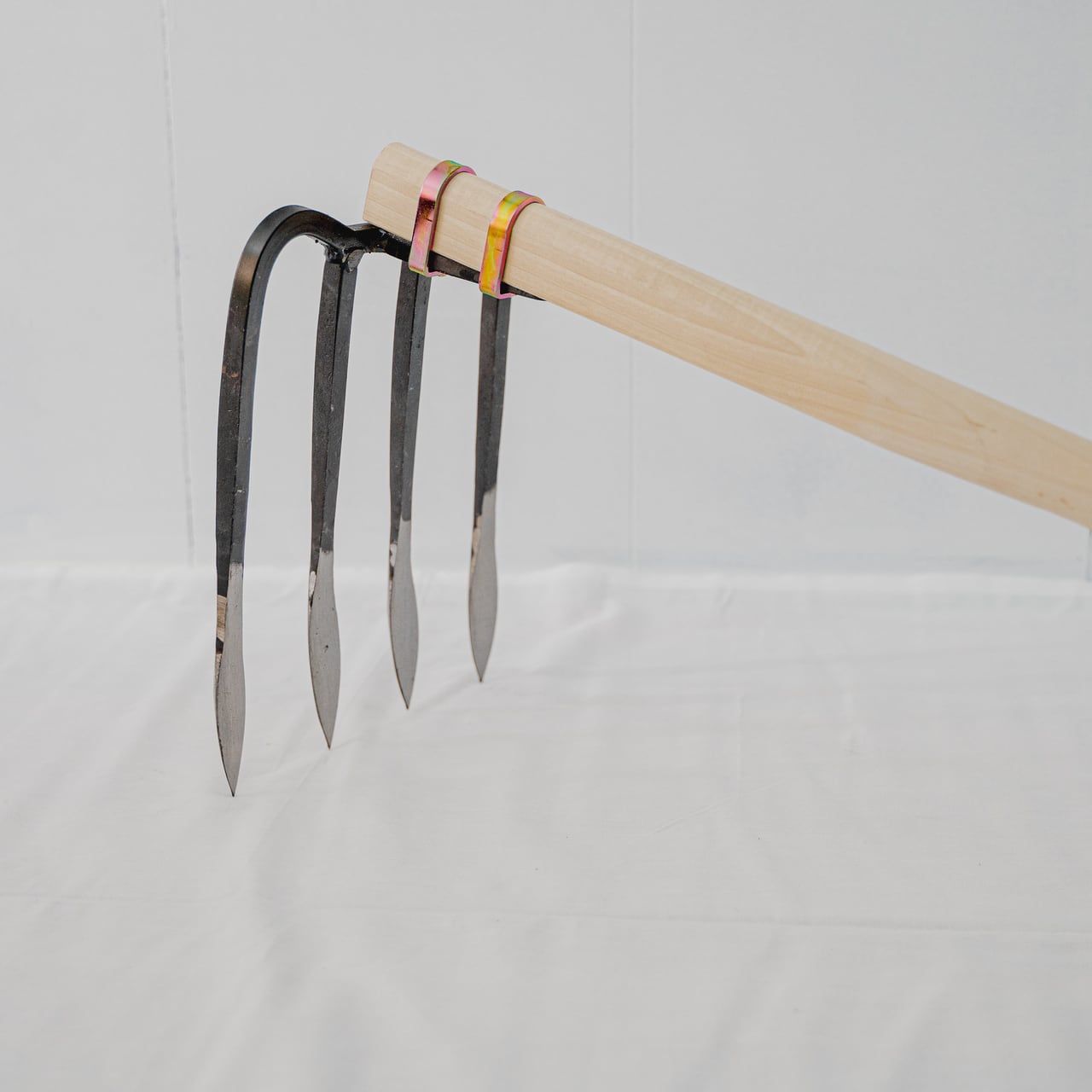 畑の耕うんに使うプロ仕様の備中鍬。先が尖っており、固い土でも中に入っていきやすく、また、刃が刃先から途中まで1本1本平べったくなっており、土を起こしやすくしております。